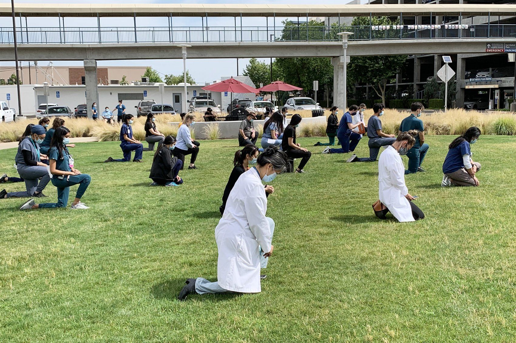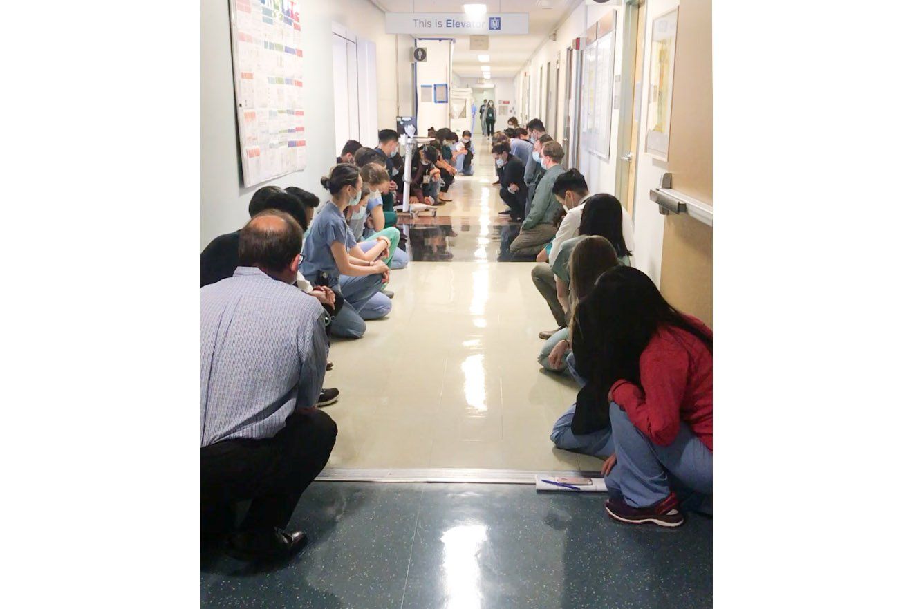 Health care workers kneel in a hallway of the UCSF Helen Diller Medical Center at Parnassus Heights on June 2 in solidarity.
