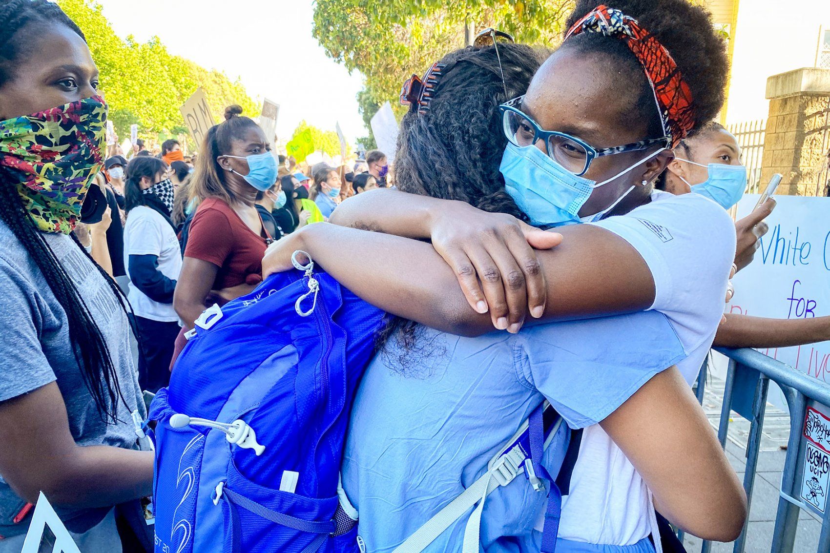UCSF residents Arthurine Zakama, MD, and Marleen Rashad, MD, embrace during a rally in San Francisco’s Mission District on June 3, which they attended with Erinma Ukoha (left), MD. Photo by Barbara Ries