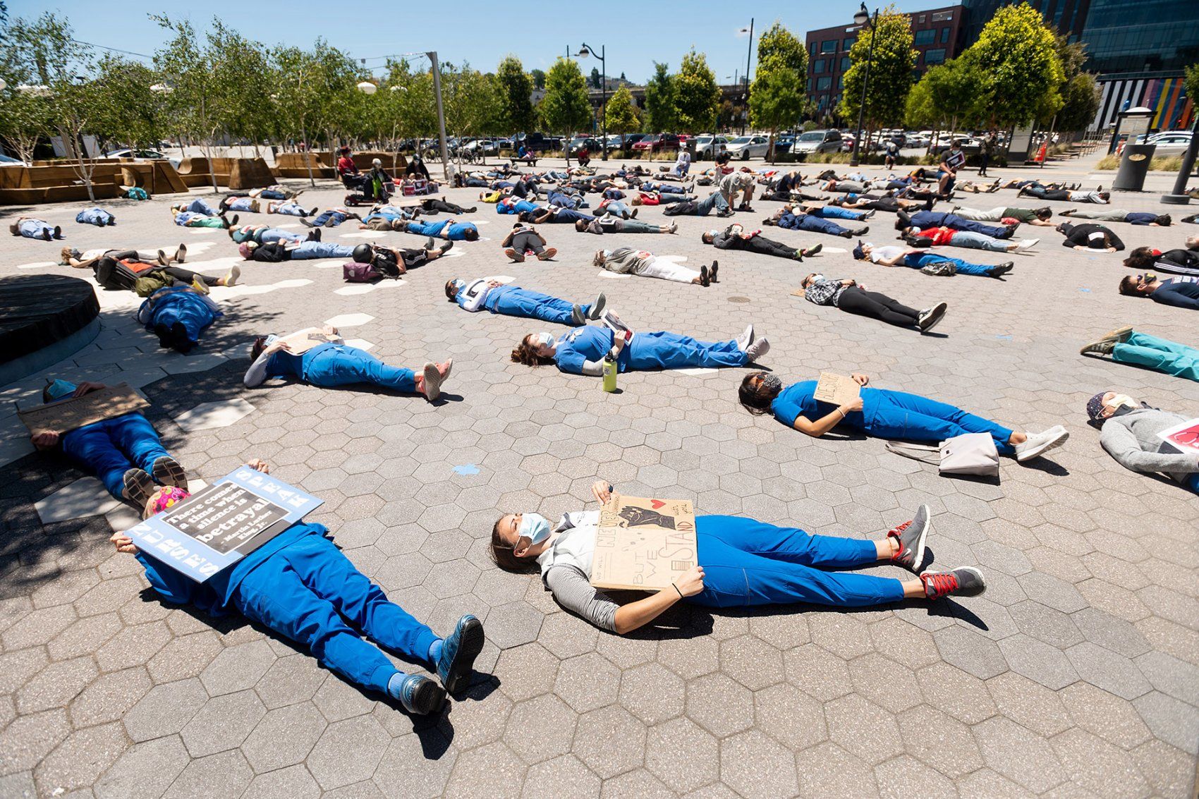 UCSF nurses and others rally at Mission Bay on June 13, including participating in a “die-in.” Photo by Noah Berger