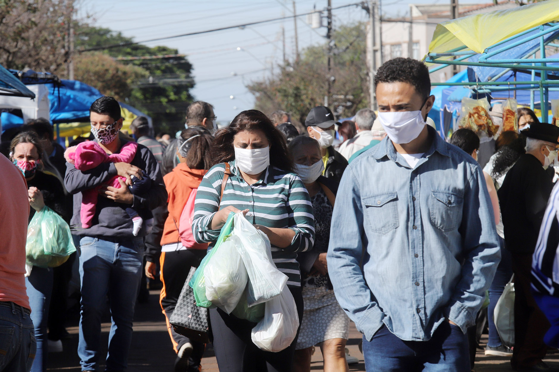 People wear masks as they walk through an outdoor market in Brazil, a country that has seen skyrocketing numbers of COVID-19 cases. Getty Images