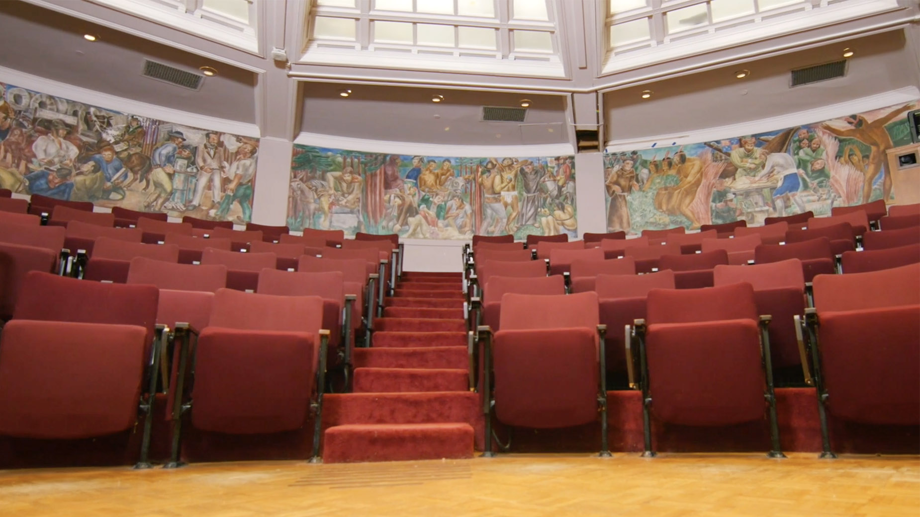 The “History of Medicine in California” murals were painted in fresco style by Polish-born artist Bernard Zakheim in the late 1930s on the plaster walls of Toland Hall auditorium, which is located in a 103-year-old building that must soon be replaced with a new facility that meets state and University of California seismic codes.