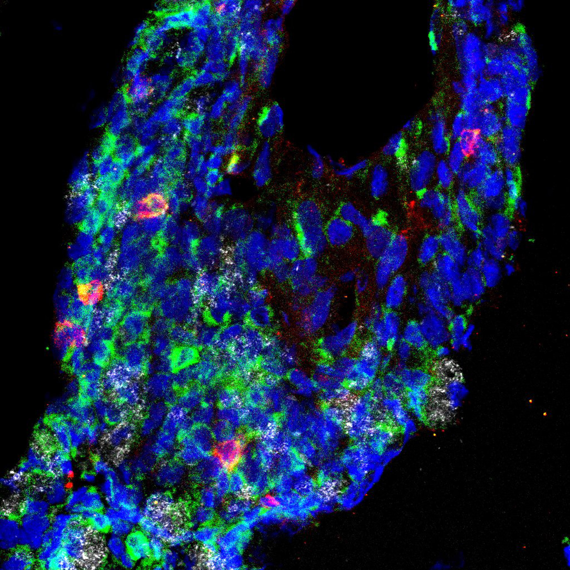 Immune cells from the gut (red) travel to the brains of patients during MS attacks and appear to lower inflammation, potentially helping to end flare-ups. Image by Baranzini lab / UCSF