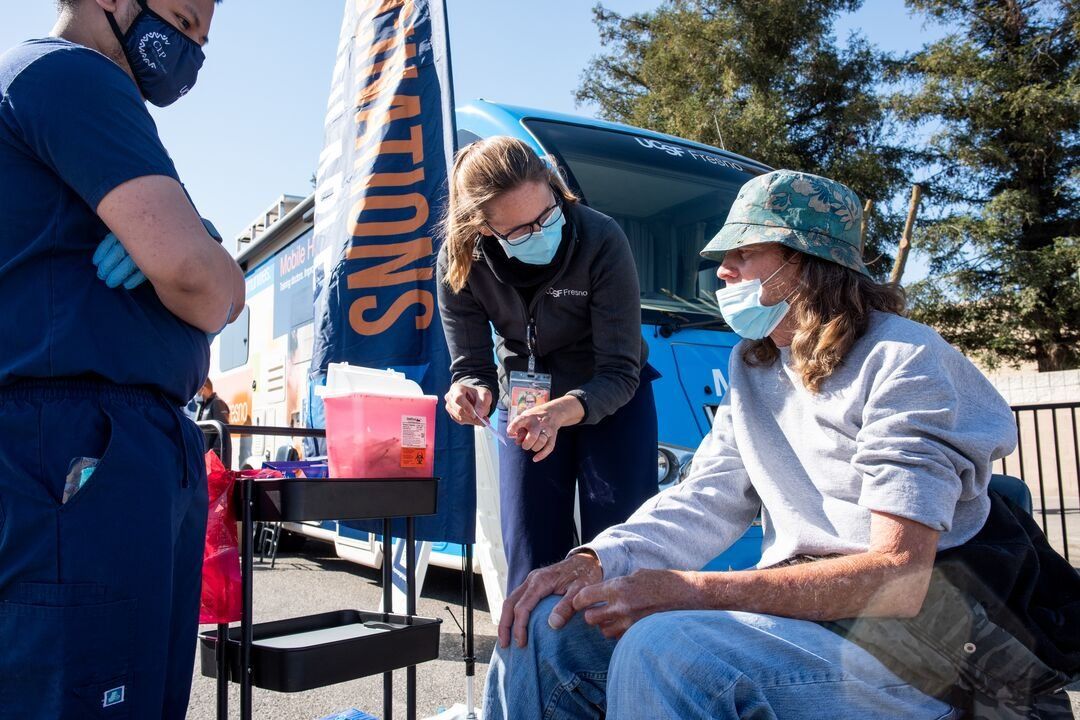 Fresno Fieldwork: UCSF Fresno medical students, led by Kenny Banh, MD, administered vaccines with the UCSF Fresno COVID-19 Equity Project to community members at Poverello House, a medical clinic, Men’s Resident Rehabilitation program, temporary overnight shelter, and social services provider. Courtney Barry, UCSF nurse practitioner, and medical student Lemuel Rivera (left) meet with community member Tim Weitcamp prior to his vaccine. Photo by Barbara Ries
