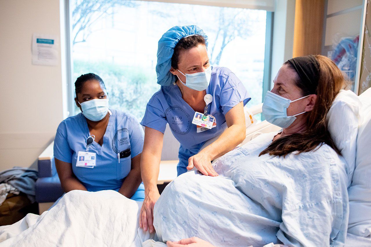 Labor and Delivery: Felicia C. Lester, MD, and Chelsea Jones, RN, check the fetal monitor and baby’s position during patient Shanna Tellerman’s labor at UCSF Betty Irene Moore Women’s Hospital in Mission Bay. Photo by Barbara Ries