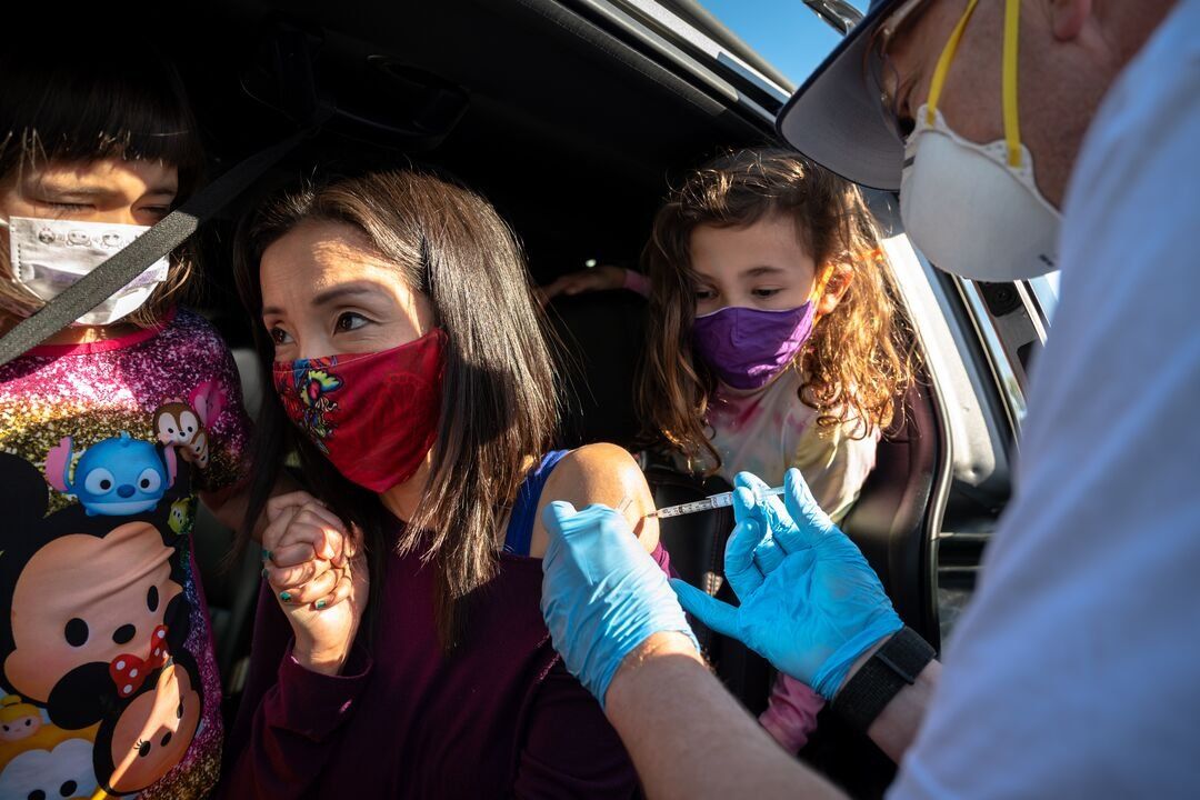Vaccine Equity: Yoshiko Stowell receives her first dose of the Moderna vaccine at a drive-through pop up community vaccination site held by Umoja Health targeting the hard hit BIPOC community. By Mike Kai Chen