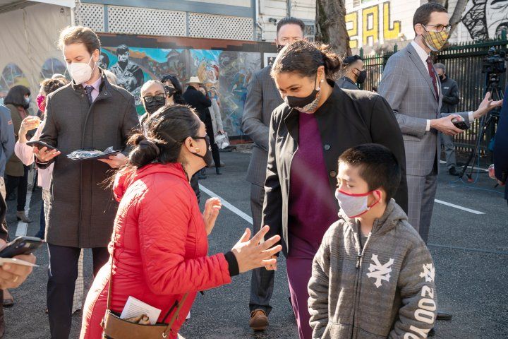 Marisol Guillen (second from left), a volunteer with the Latino Task Force, and her son greet San Francisco Mayor London Breed during the opening of Unidos En Salud's first COVID-19 mass vaccination site. The partnership between UCSF and the Latino Task Force opened a site for frontline essential workers within the Latinx community. Photo by Mike Kai Chen