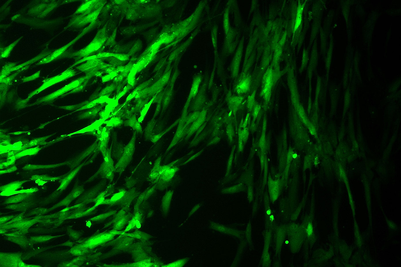 Osteoblasts infected with a virus containing a green fluorescent protein. Image courtesy Nadav Ahituv.