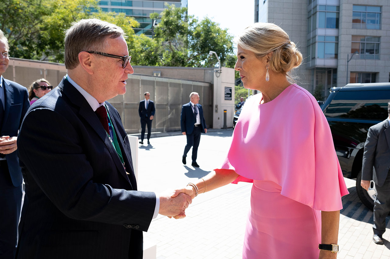 Chancellor Sam Hawgood greets Queen Máxima, of the Netherlands, who came to UCSF Tuesday with a delegation of Dutch companies to learn about innovations in health technology.