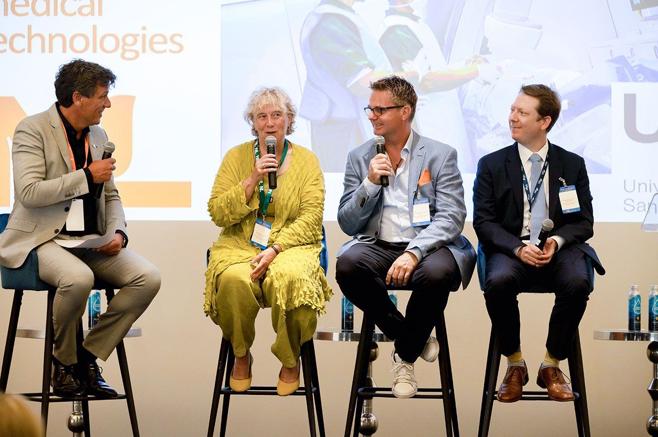 Jacco Vonhof, far left, director MKB-Nederland, UCSF cancer researchers Laura van ‘t Veer, and Jeroen Roose, and UCSF digital health expert Aaron Neinstein, speaking about new directions in health technology during the Dutch trade mission to California.