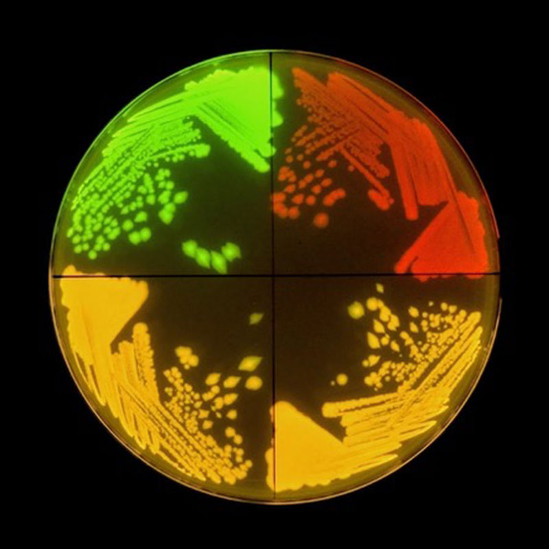 Plates of E. coli strains in the mouse gut, demonstrating Turnbaugh’s success editing a single gene: