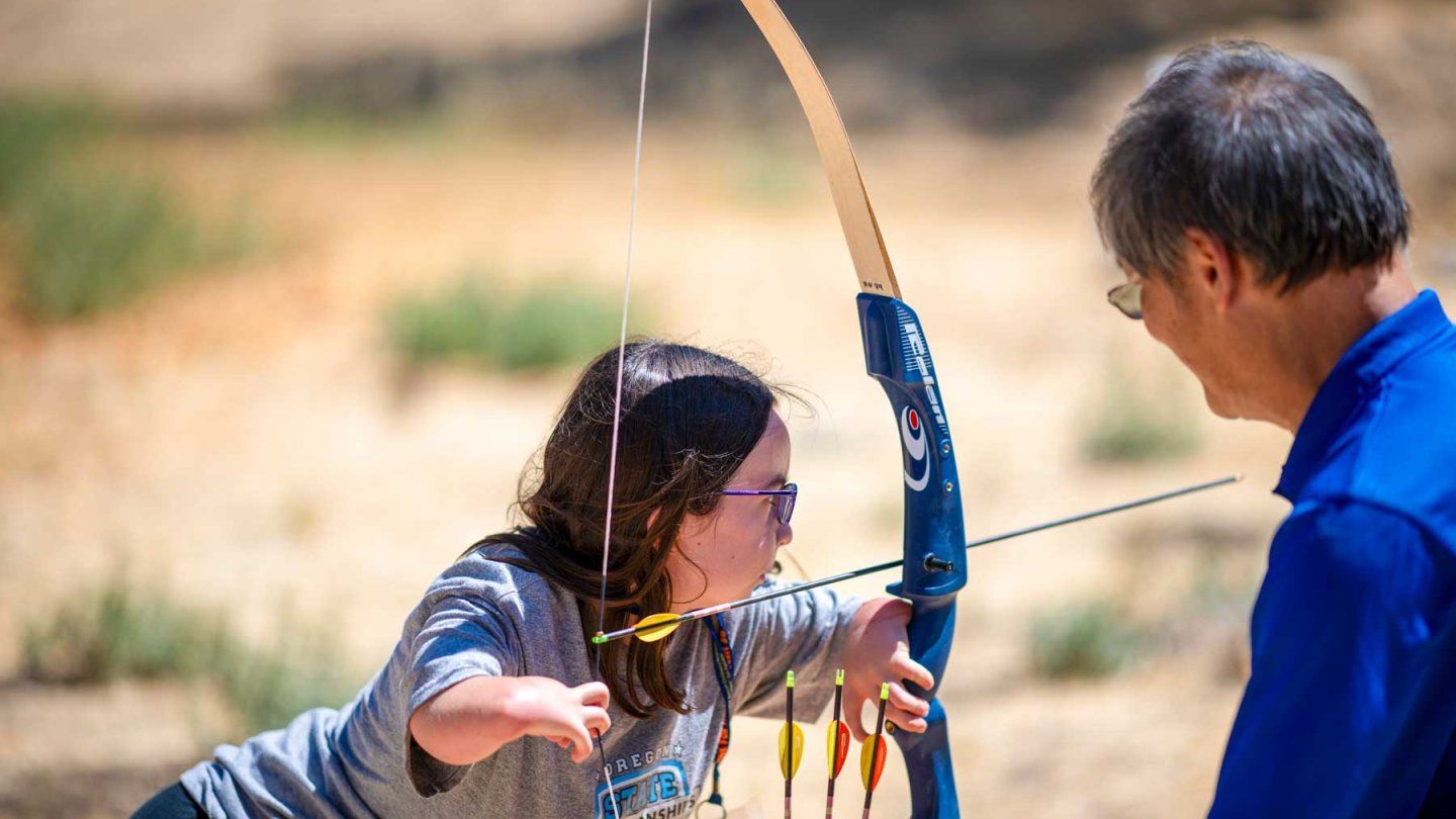 Up and down the range, Parker and his fellow campers take aim at paper targets pegged to haybales. Nearby, two counselors sit on either side of a young girl and hold her bow between them. She draws back the bowstring with her feet.