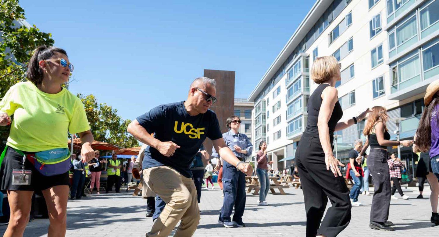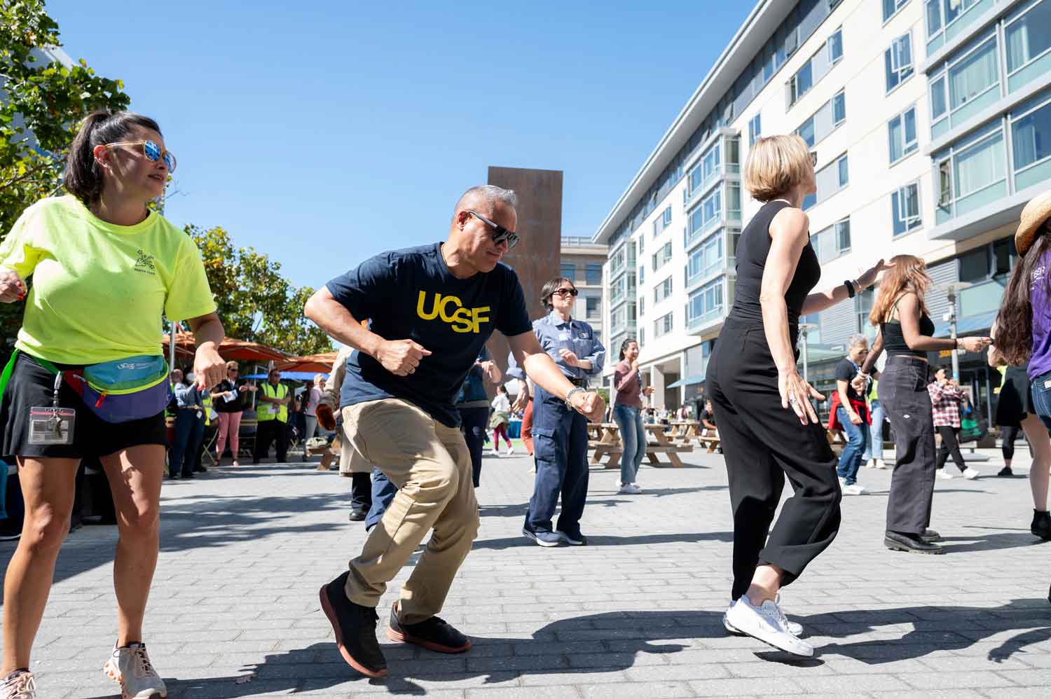 After a seven-year hiatus, Gene Friend Way Plaza on the Mission Bay campus was packed to the brim with more than 1,500 UCSF faculty, staff and learners enjoying the return of the beloved event. Booths representing many of UCSF’s programs and offices lined the plaza, anchored by a live band, chalk drawing contest, and competitive games of cornhole and Jenga.