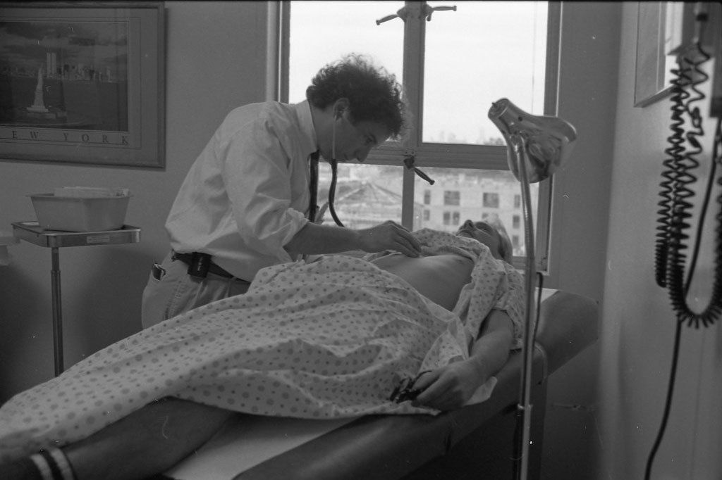 This photo is part of the Powers (David) Photograph Collection, which contains photographs created by freelance photographer David Powers while on assignment for UCSF between 1975 and 2002. Here, Mark Feinberg examines an AIDS patient at San Francisco General Hospital’s Ward 86.