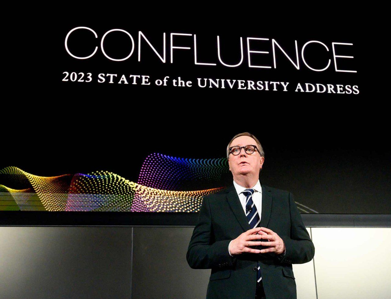 “Confluence” was the theme of Hawgood’s 10th annual address, delivered live at the Mission Bay campus. It marked the first in-person gathering for the event since the COVID-19 pandemic