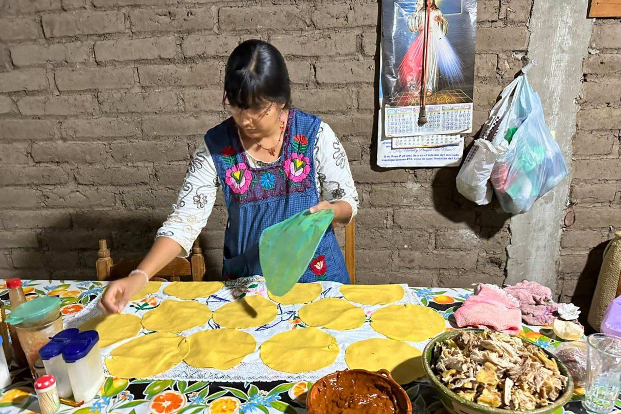 Pérez-Aguilar cleans milpa leaves (left) and makes amarillito and chicken tamales (right) during a Dia de Muertos celebration, part of her work with a traditional healer and their family.