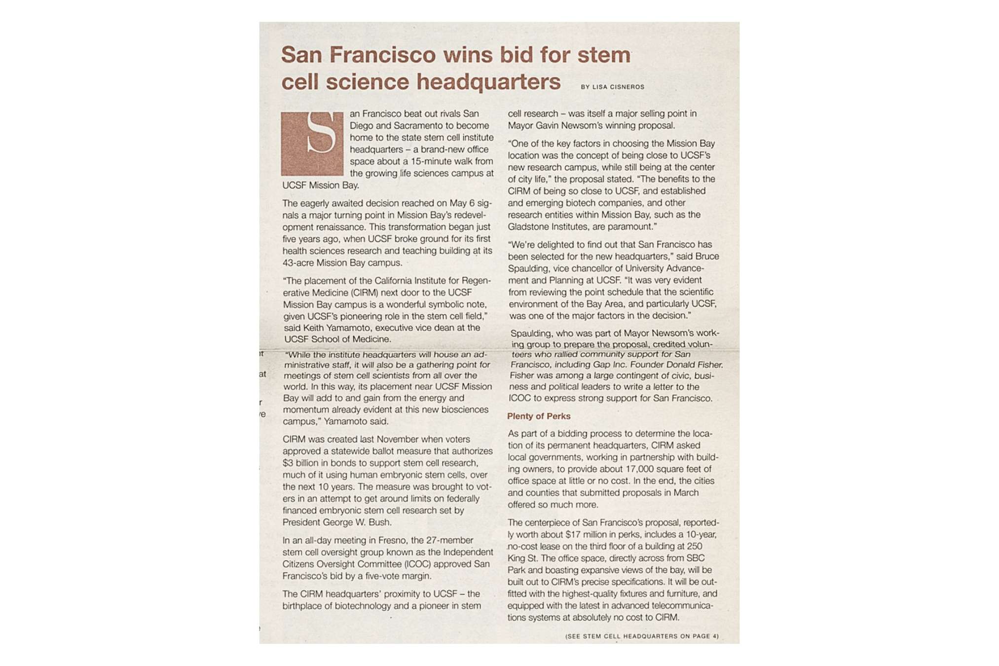 “The need to find space to expand UCSF’s research and education activities prompted robust discussions about where we were going to develop our second major campus. Once Mission Bay was secured with the donation of 43 acres to UCSF, my job was all about covering how we would make our ambitious vision a reality. It was sort of like, if UCSF builds it, biotech and businesses will come.”