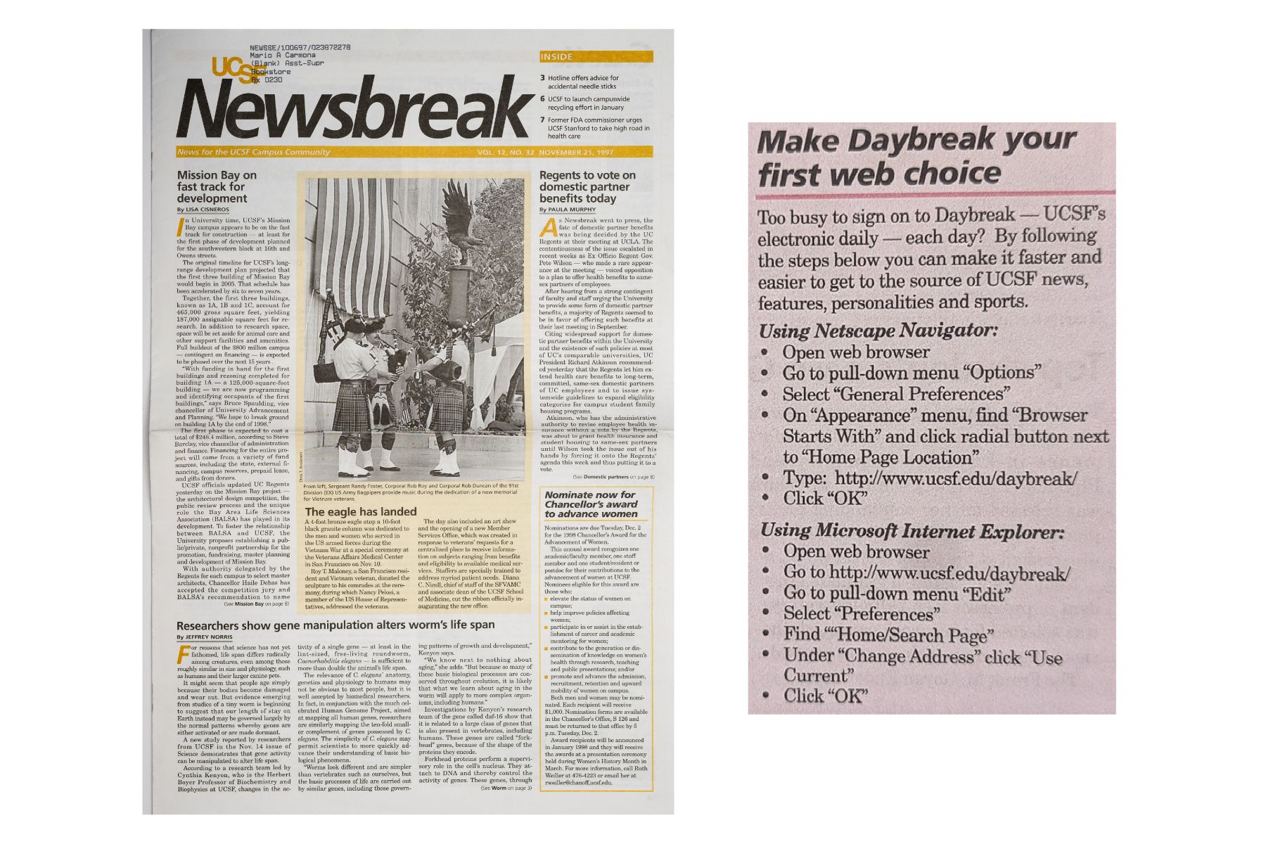 As the rise of the internet changed the way UCSF Public Affairs published stories about the University, the eight-page paper evolved – taking on a magazine-style feel before ultimately moving to an online publication called Daybreak.