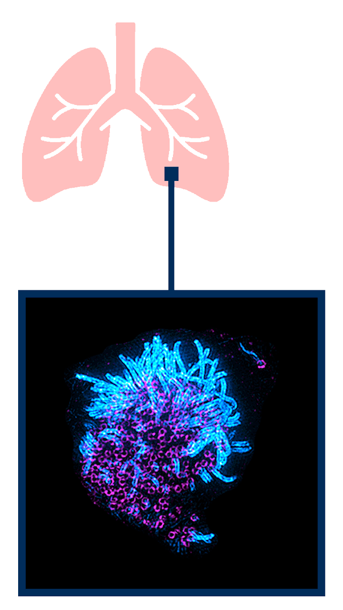 Two lung cells with centrioles (magenta) and cilia (cyan). The primary ciliated cell (left) is a precursor cell, which has just begun the multiciliation cycle. The more mature multiciliated cell (right) has hundreds of centrioles and cilia as a result of the multiciliation cycle.