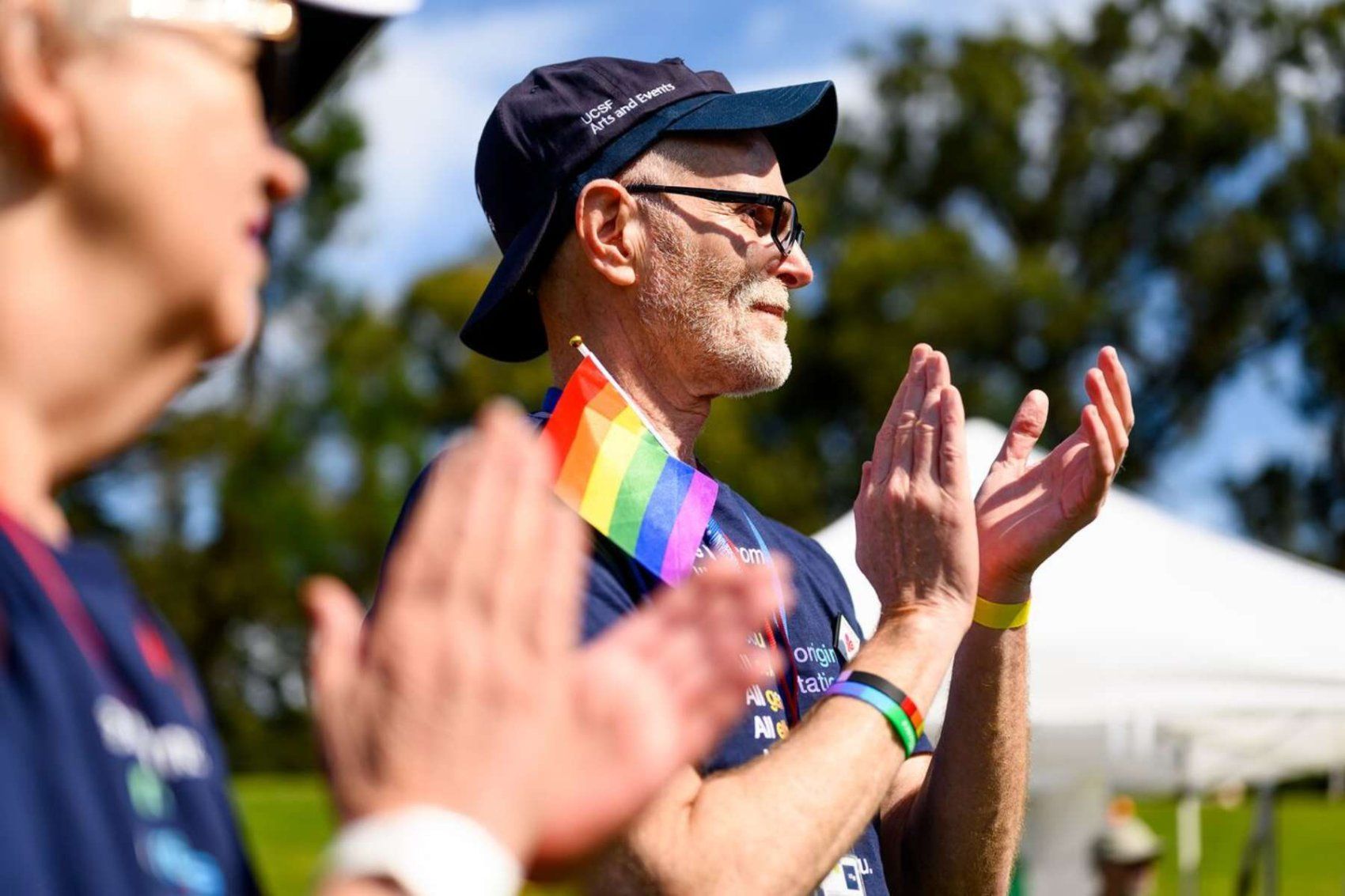 UCSF reimbursements coordinator Stephen Dalton claps during AIDS Walk on Sunday, July 16, 2023, in San Francisco. Photo by Noah Berger