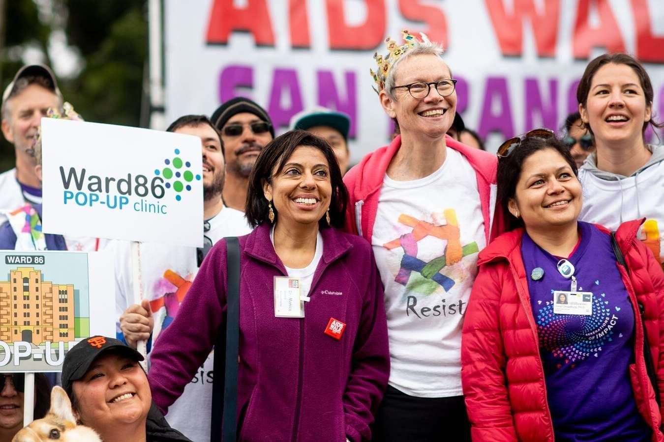Ward 86 Medical Director Dr. Monica Gandhi, center left, stands with UCSF community members during AIDS Walk on Sunday, July 14, 2019, in San Francisco. From left to right are Dr. Gandhi, UCSF nurse practitioner Mary Lawrence Hicks who serves as deputy clinic director of Ward 86, and UCSF postdoctoral scholar Sona Chowdhury, PhD. Photo by Noah Berger