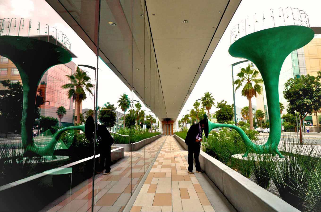The award-winning duo’s “monumental, interactive sound sculpture” called “Skyhorn” towers 12 feet high and decorates the building’s 3rd Street side.