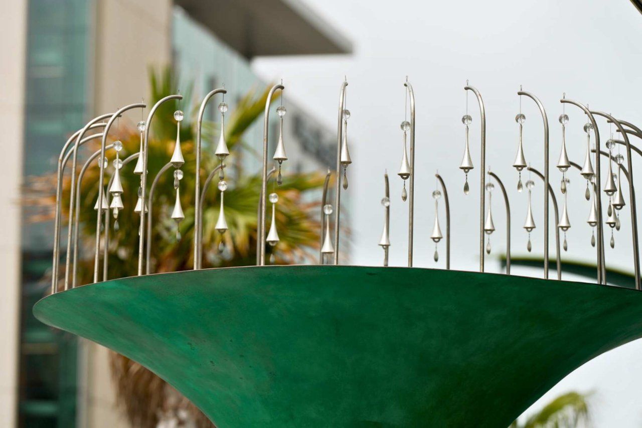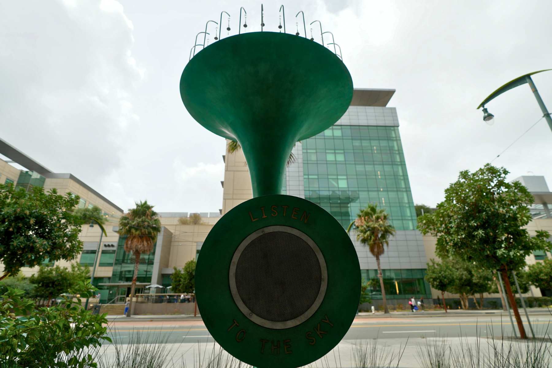 Cast in bronze with a blue patina, the sculpture consists of a large bell-shaped horn facing upward that connects to a smaller bell-shaped horn at the pedestrian level. Embossed raised letters around the small horn’s perimeter invite patients and passersby to “listen to the sky.” At the top of “Skyhorn,” a circular array of 28 wind-activated bells rims the perimeter of the large horn, producing an ethereal tone that varies with the blowing Mission Bay wind.
