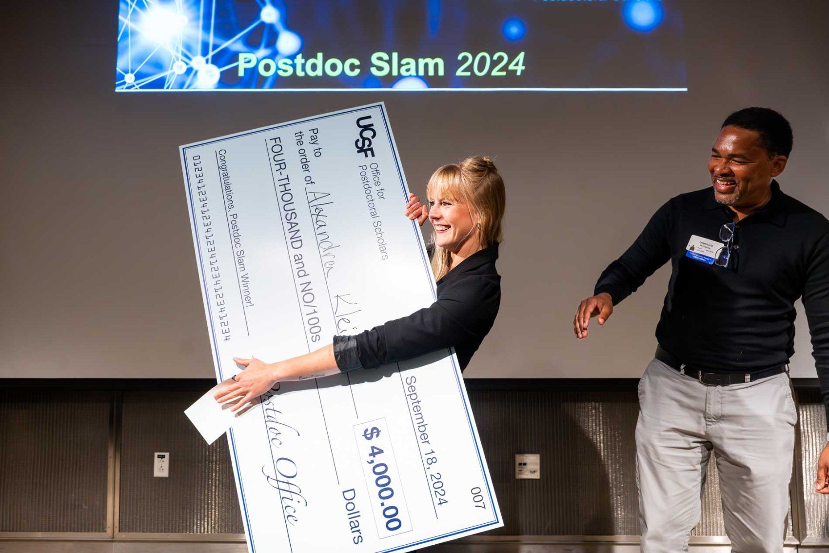 Klein’s gift of clear communication and a thoughtful, circular narrative won her first place at the Postdoc Slam. She walked away with $4,000.