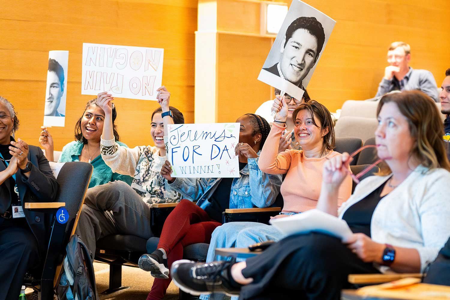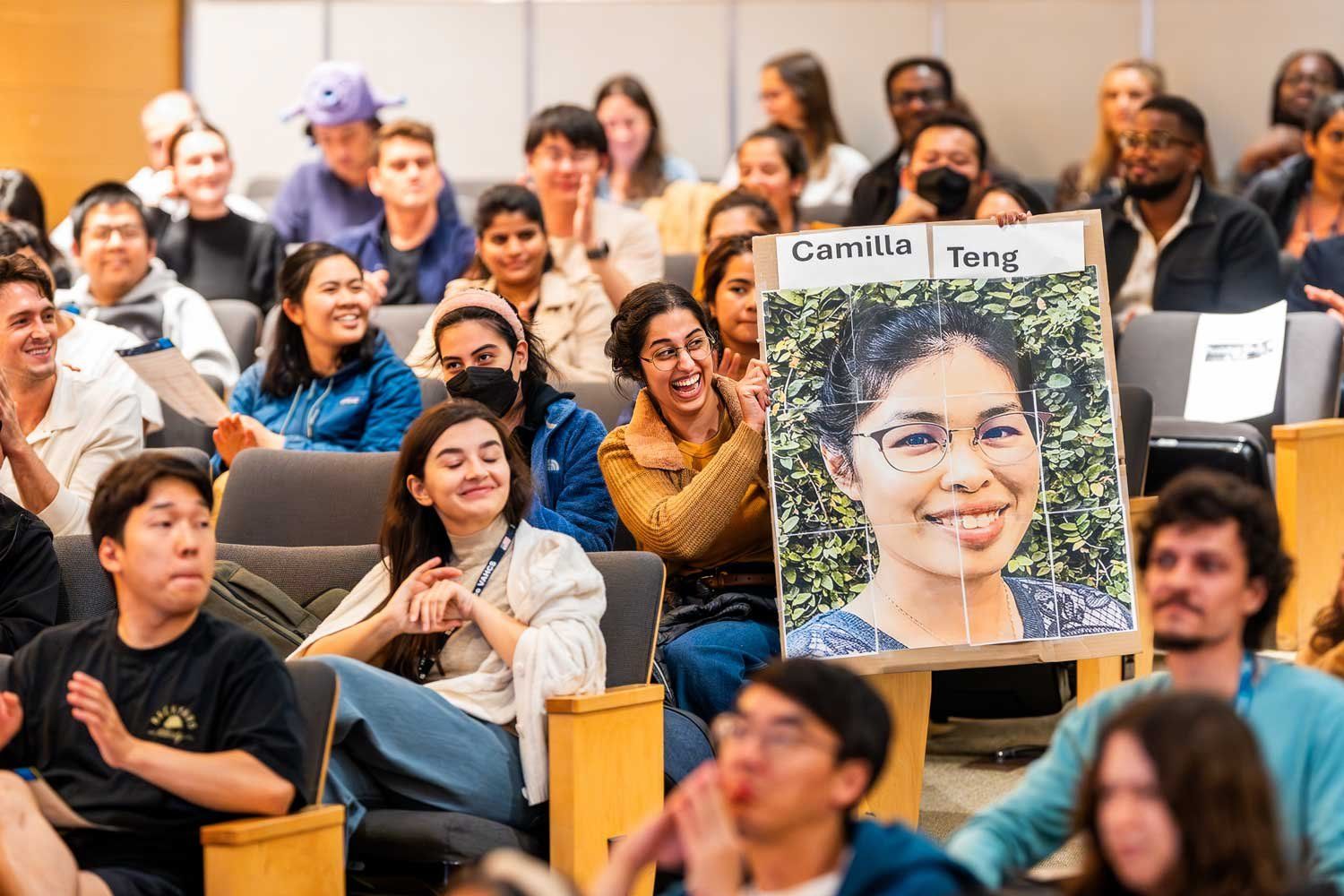 Audience members cheer for contestant Jeremy Ford, PhD. Holding his photo is Gladstone research associate Vivianna DeNittis. Photo by Noah Berger