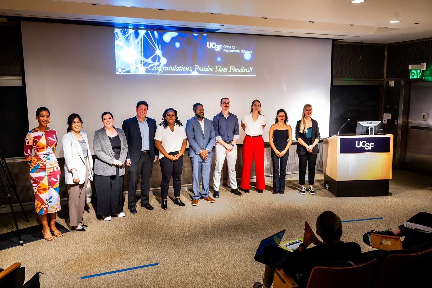 Postdoc Slam 2024 participants stand for applause. From left to right: Taylor B. Rogers, PhD, MPH; Camilla Teng, PhD; Ana Lyons, PhD; Jeremy Ford, PhD; Alicer K. Andrew, PhD; Roddrick Dugger, PhD; Colin Hoy, PhD; Rebecca L. Knoll, MD; Sonia Nocera, PhD; and Alexandra Klein, PhD. Photo by Noah Berger