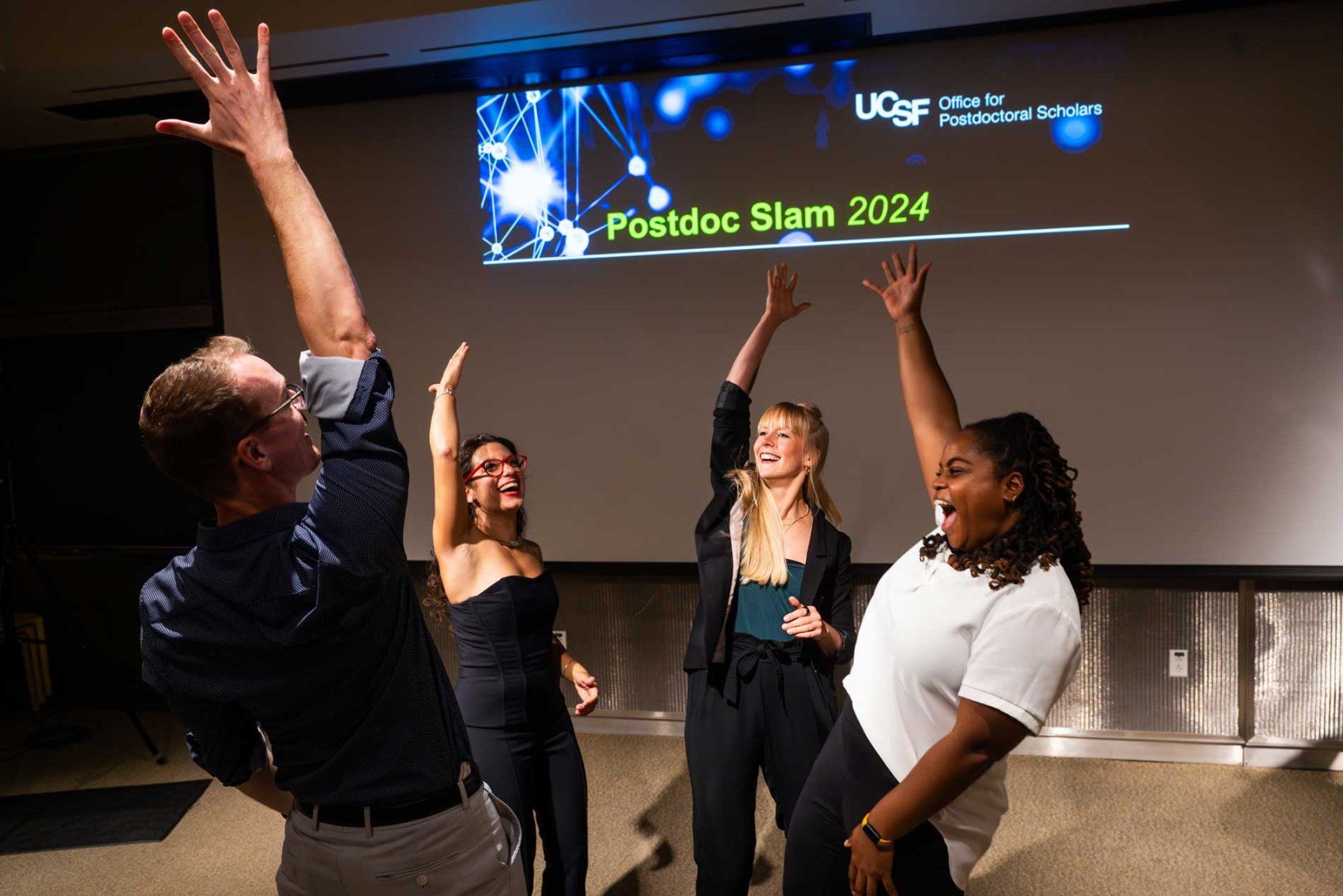 The 2024 Postdoc Slam winners celebrate together onstage. Photo by Noah Berger