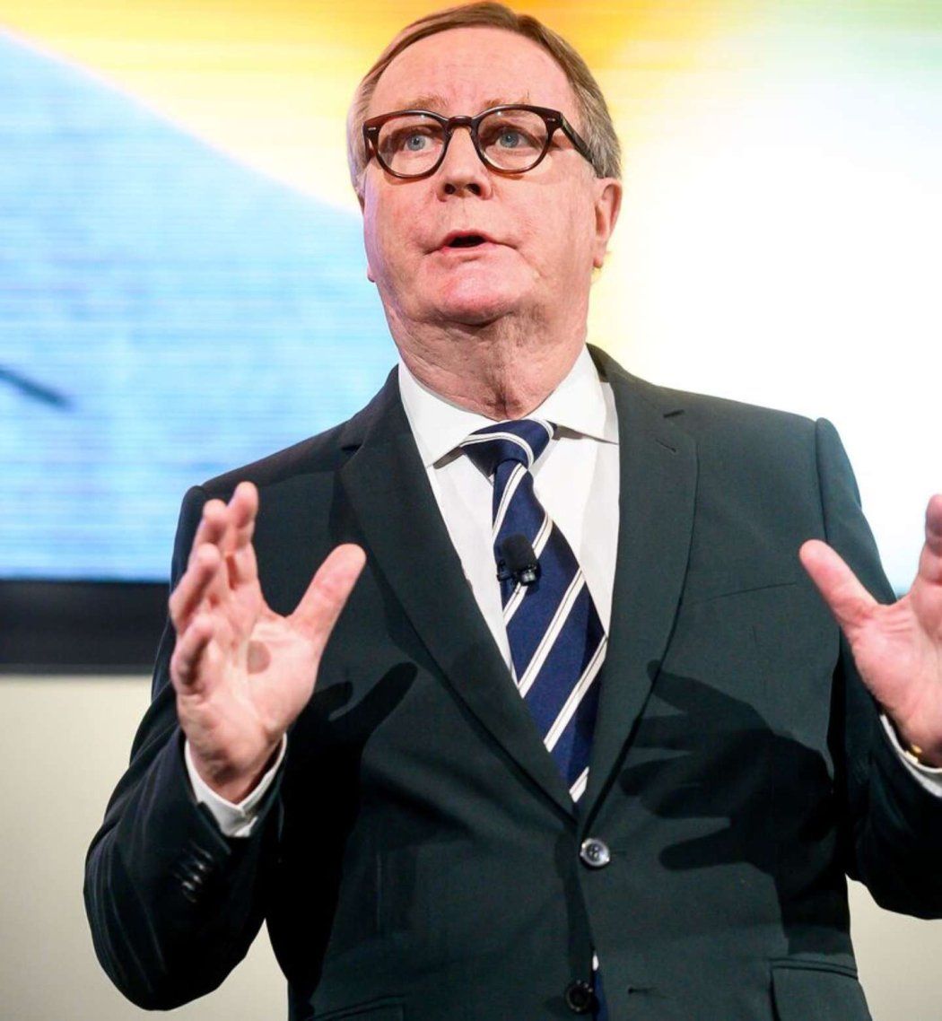 Chancellor's Sam Hawgood speaking with large hospital image behind him.