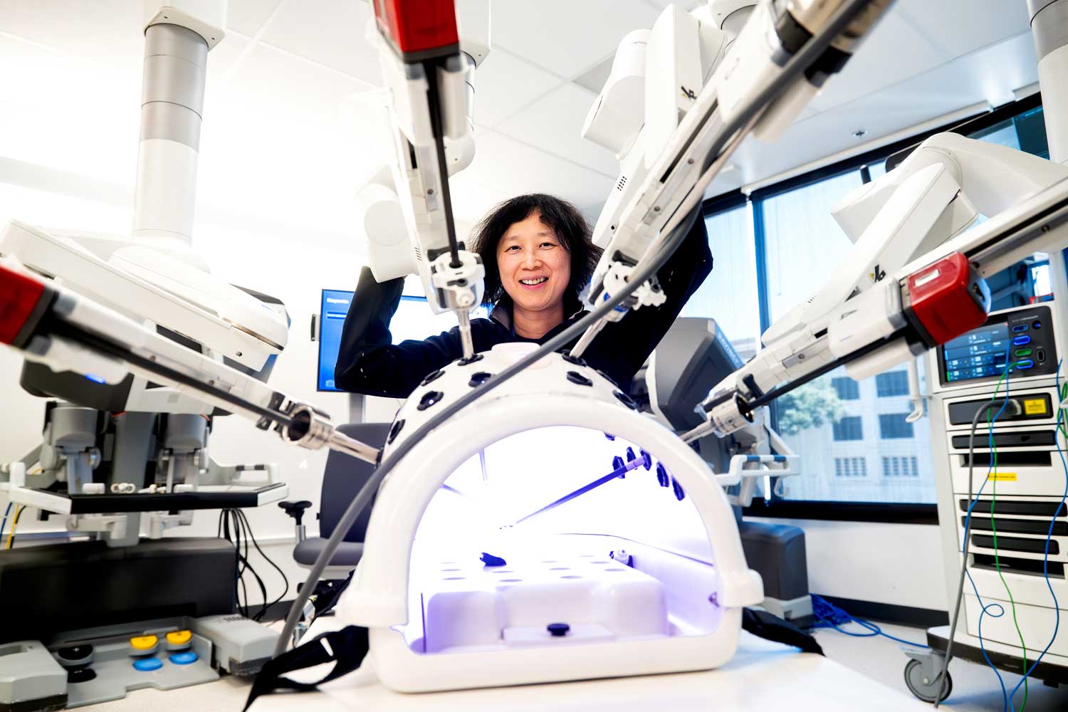 Alan Zambeli-Ljepovic, MD, MHS, sits at the arcade-like console like a church organist. He places his feet on the machine’s pedals and slips the middle finger and thumb of each hand into delicate pincher-like loops. The nearly six-foot-tall surgery robot beside him stirs to life in UC San Francisco’s Surgical Skills Lab.