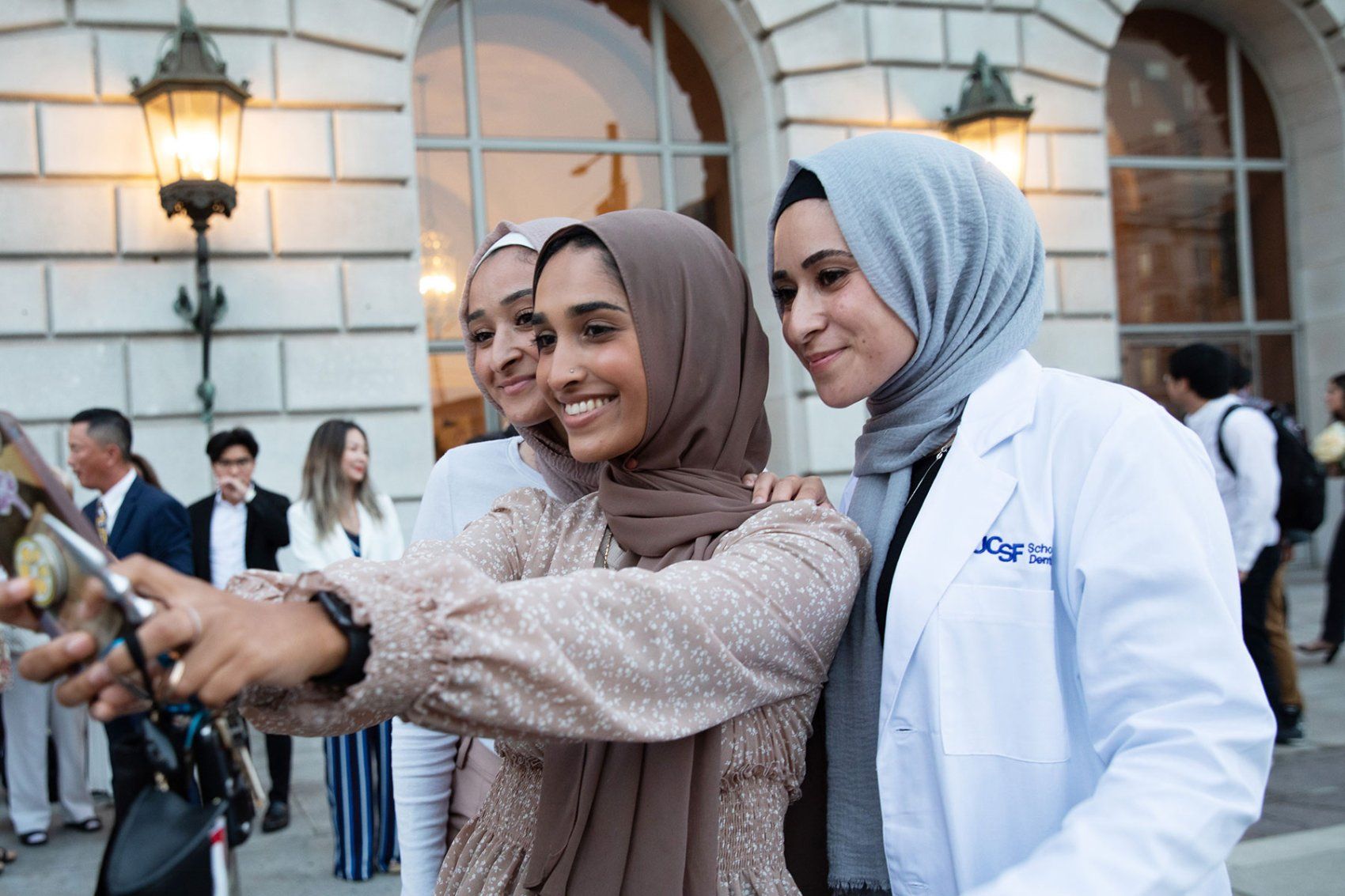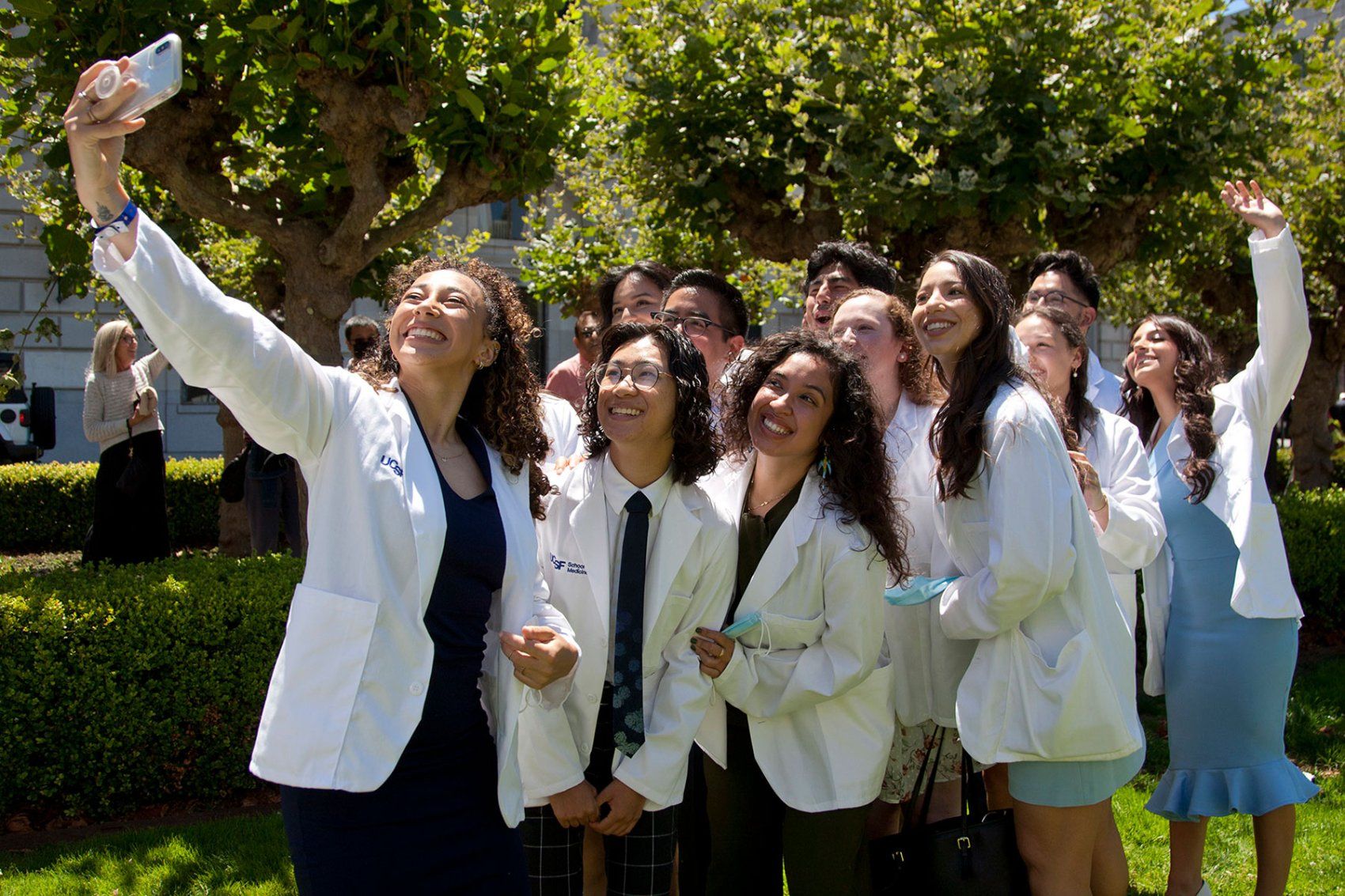 UCSF School of Medicine students take a selfie ahead of their white coat ceremony on Aug. 8. The class of 2026’s ceremony was the first in-person white coat ceremony since 2019. Photo by Cindy Chew