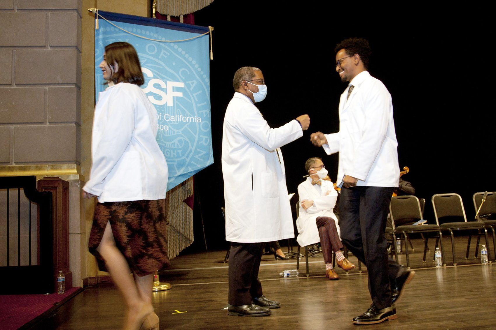 UCSF School of Medicine Dean Talmadge E. King, Jr., MD, (center) fist bumps students as a congratulations after they donned their white coats. Photo by Cindy Chew