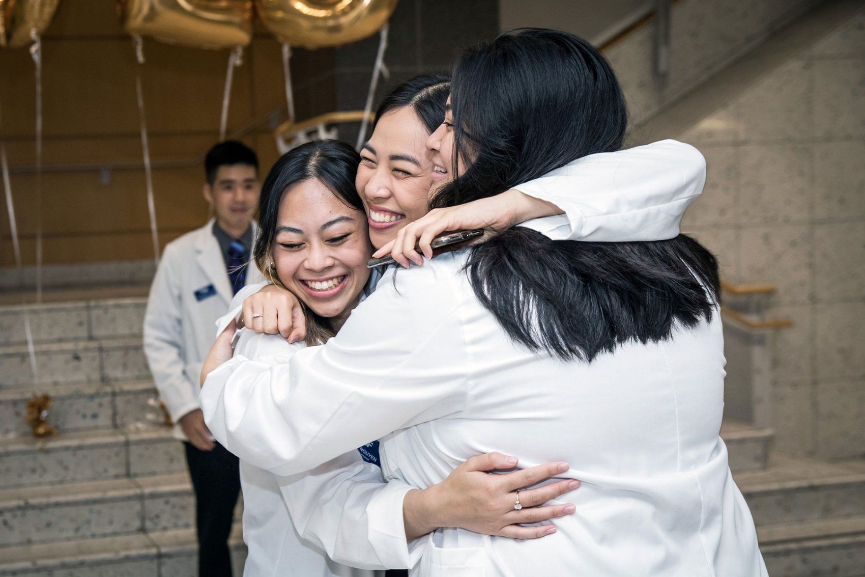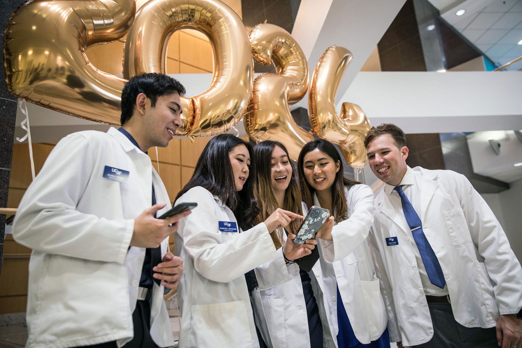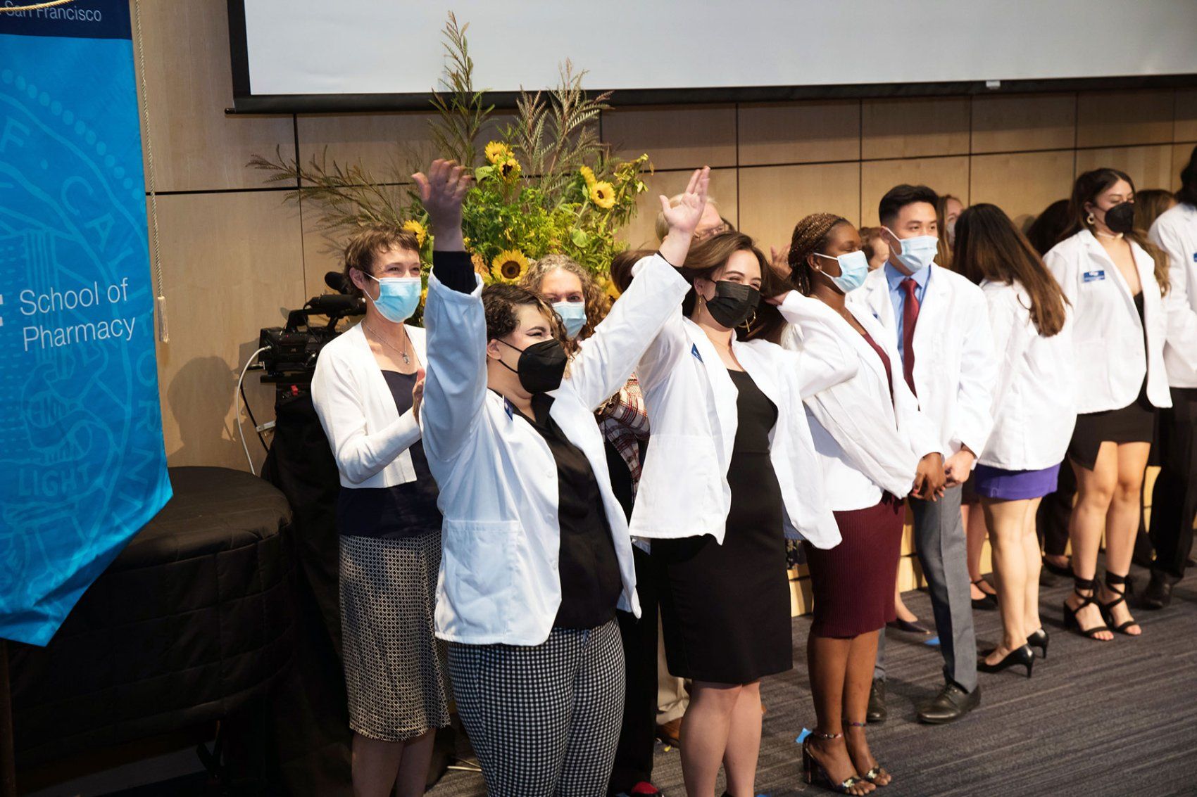 UCSF School of Pharmacy students celebrate after their in-person white coat ceremony. Photo by Elisabeth Fall