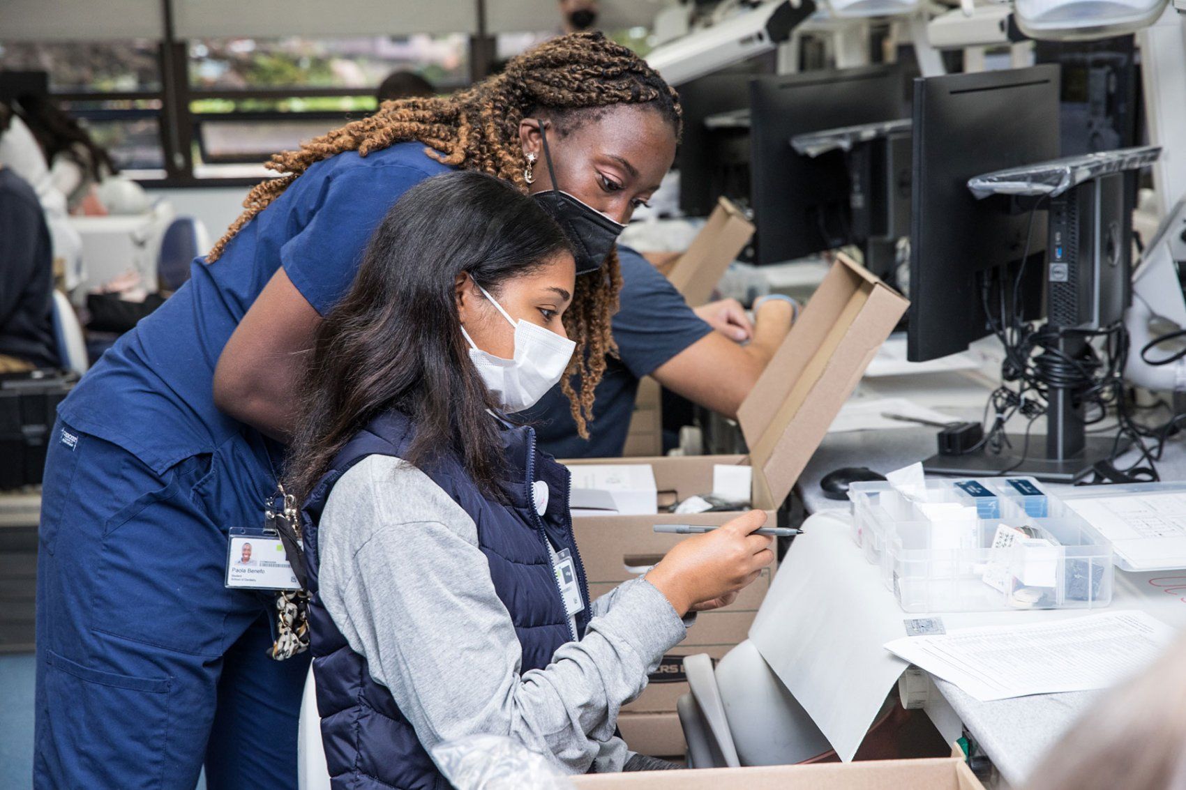 Second-year School of Dentistry student Paola Benefo and first-year student Berry Birbo look through dental supplies.