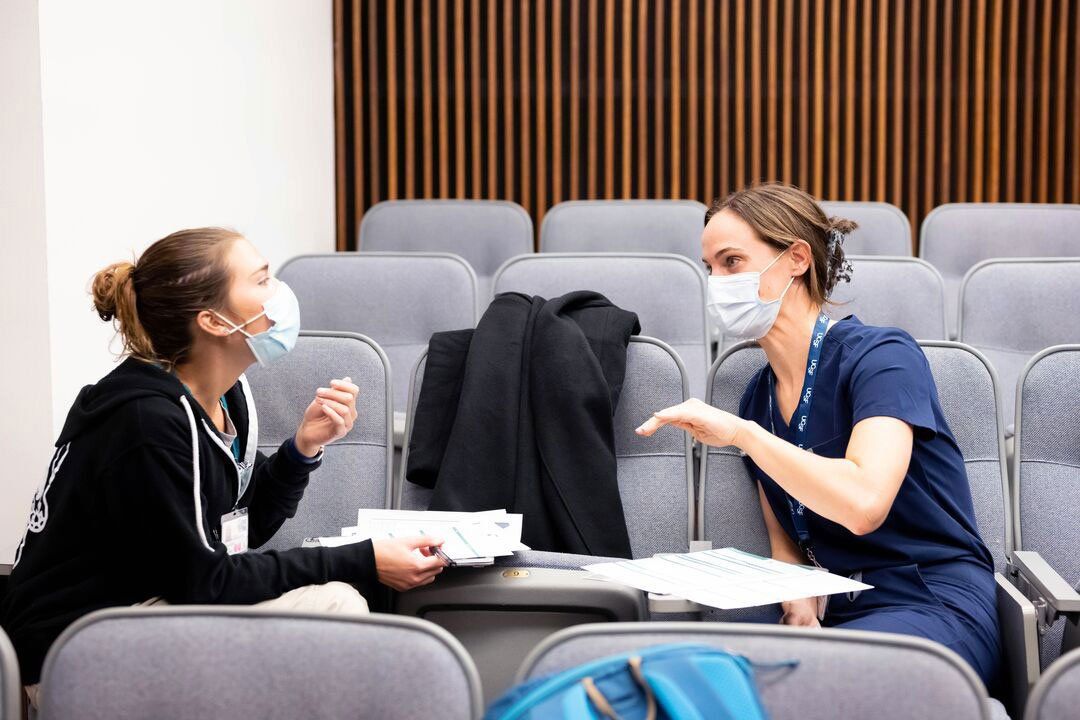 Kalmia Beets (left) and Elena Walterman, master’s students in the School of Nursing pediatric nurse practitioner specialty, participate in a mock clinical visit in the first skills lab of the fall. Photo by Susan Merrell